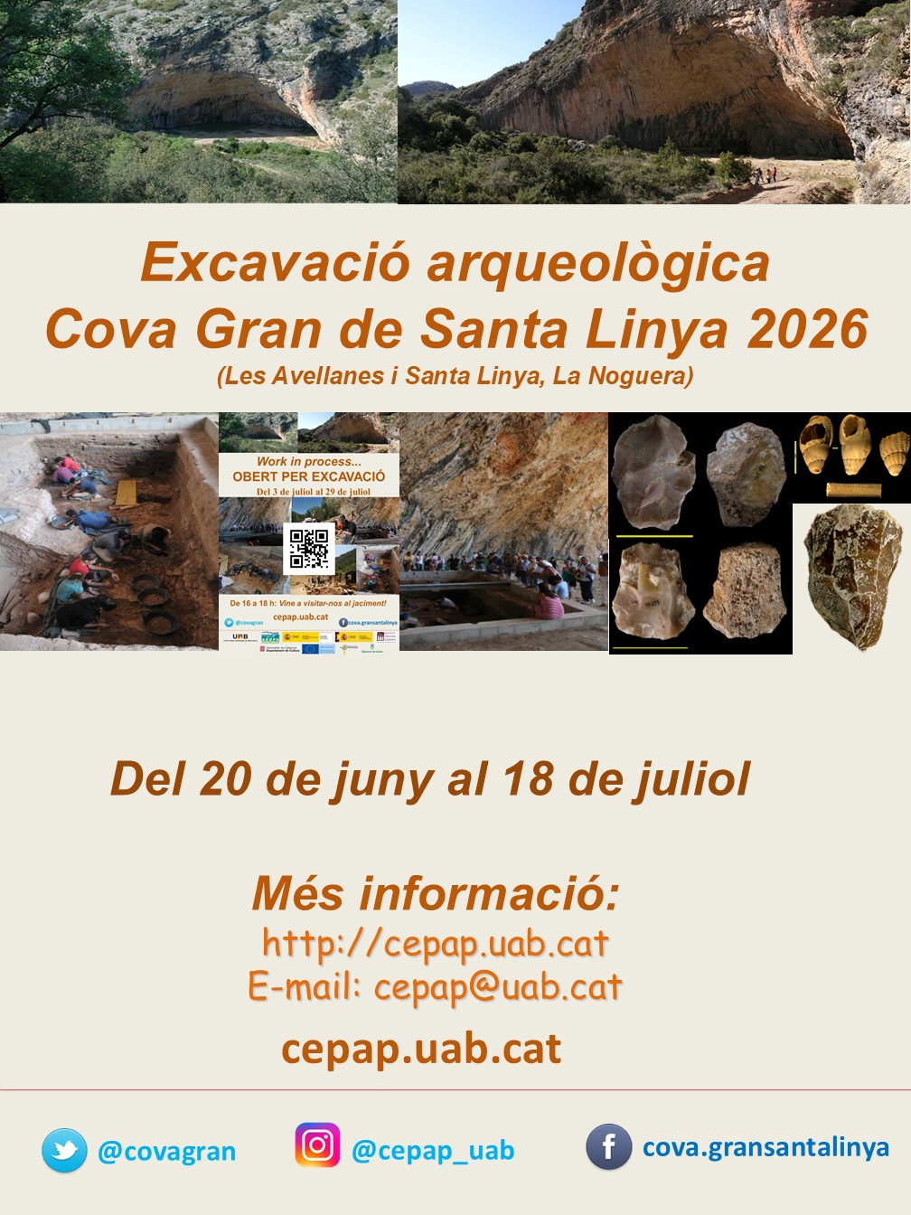 S’obre el termini d’inscripció per participar a la campanya d’excavació del jaciment de la Cova Gran de Santa Linya (Les Avellanes i Santa Linya, La Noguera, Lleida) que es durà a terme entre el 20 de juny  i el 18 de juliol de 2026.